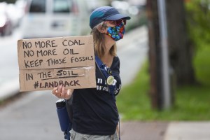 2021年9月24日,在哈利法克斯举行的“气候变化学校罢工”中,一名抗议者举着“不再使用煤炭,不再使用石油,将这些化石留在土壤中#landback”的标语。-图片来源:Zane Woodford