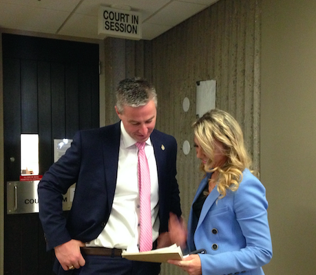 昨天,PC领导人蒂姆·休斯顿在法庭外与律师兼参谋长妮可·拉福斯·帕克协商。图片:Jennifer Henderson