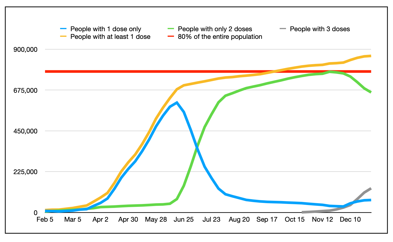 上图显示了流感大流行期间每周五的疫苗接种进度。黄线代表的是至少蓝线是只注射了一剂疫苗的人。绿线表示只服用了两剂的人。灰色的线是三种剂量的人。红线代表80%的人口。