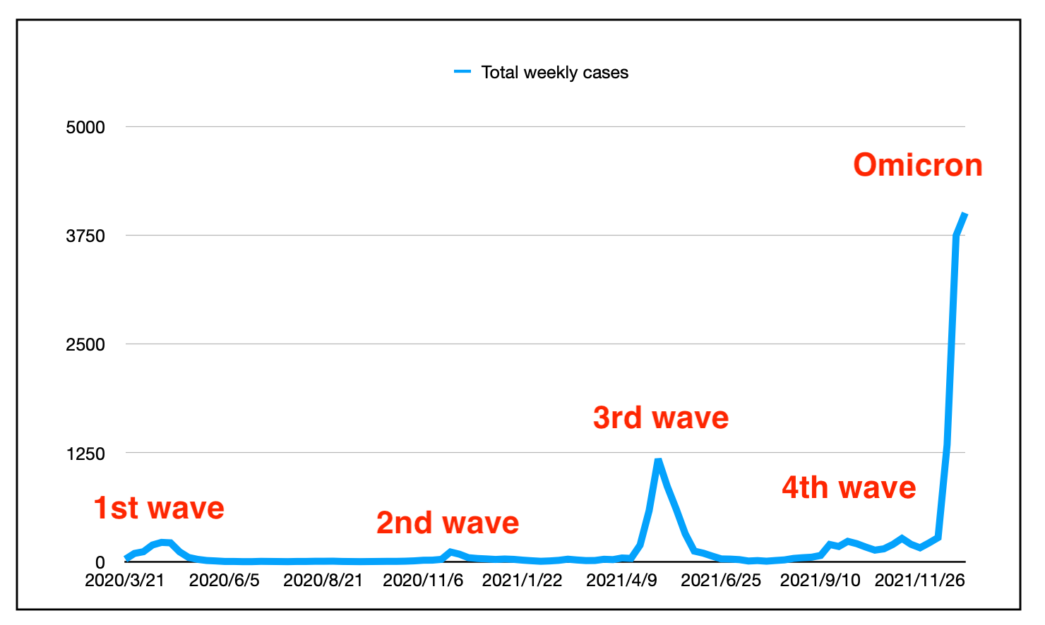 上图显示了大流行期间每周(周六至周五)的新病例数。