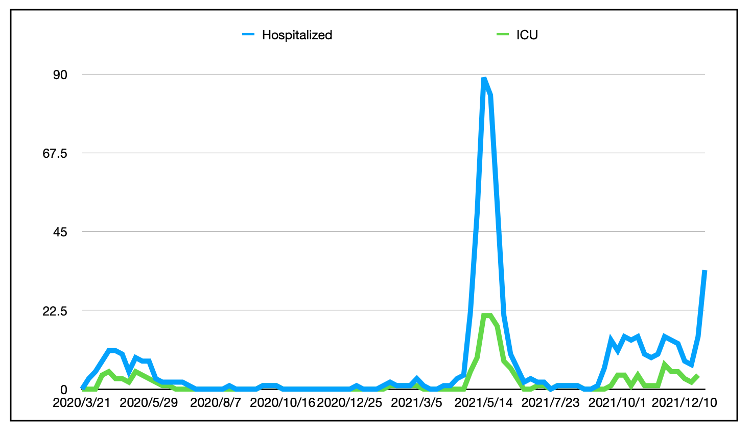 下图显示了在疫情期间,每周五住院和住在重症监护室的人数。