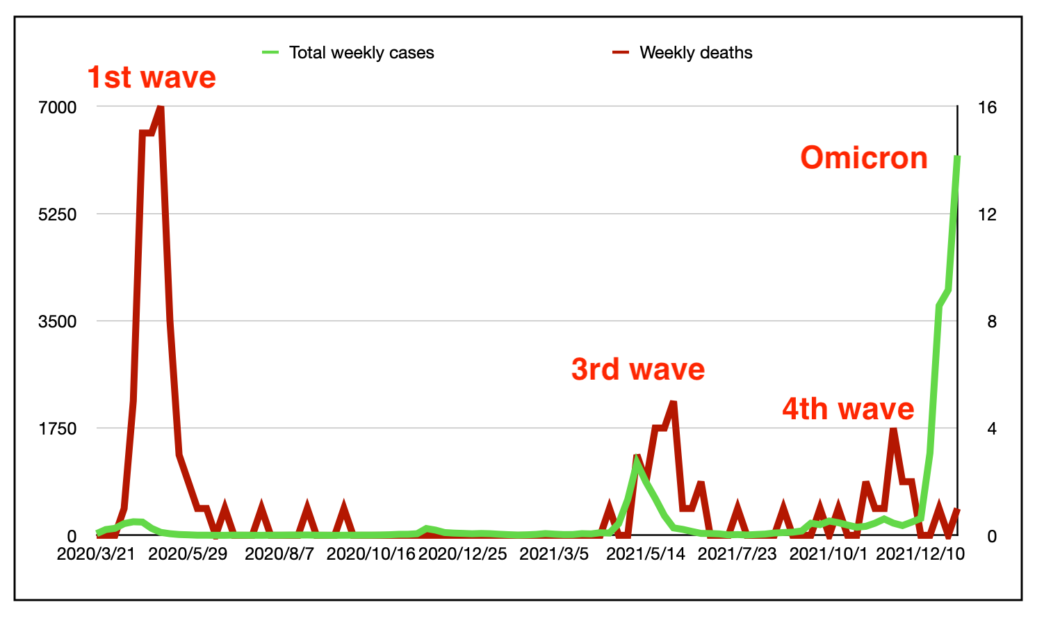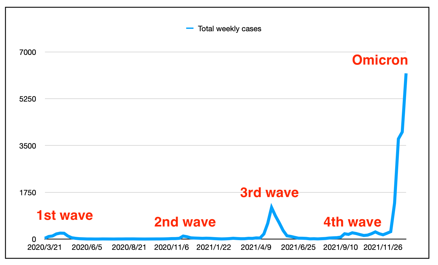 上图显示了大流行期间的每周(SAT-FRI)新病例数。