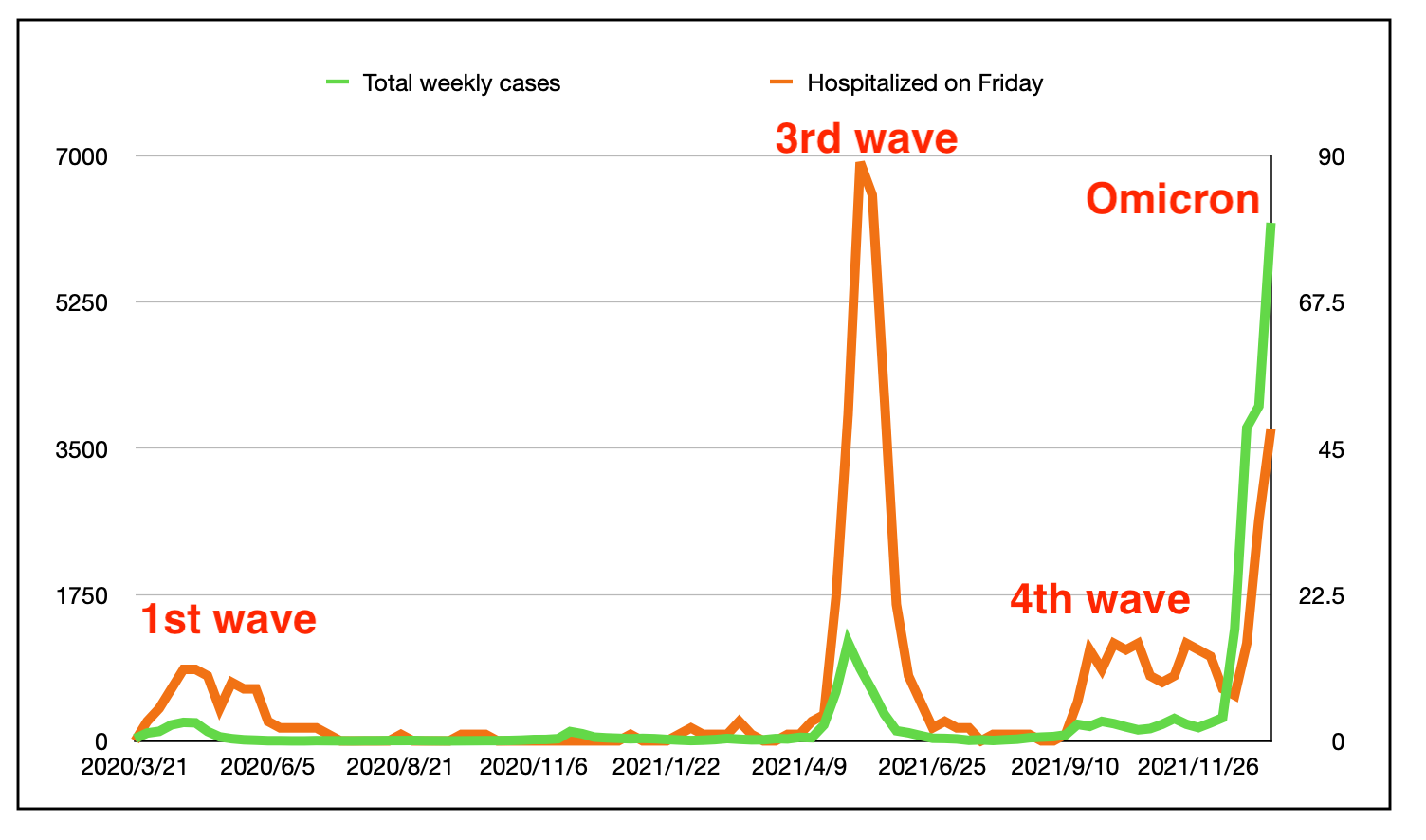 住院与死亡的比率(上面;每周的病例为绿色,左轴,住院是橙色的,右轴是相似的,但并不明显。也就是说,与以前的变体相比,Omicron在医院的百分比较低,但由于Omicron的比例更低。
