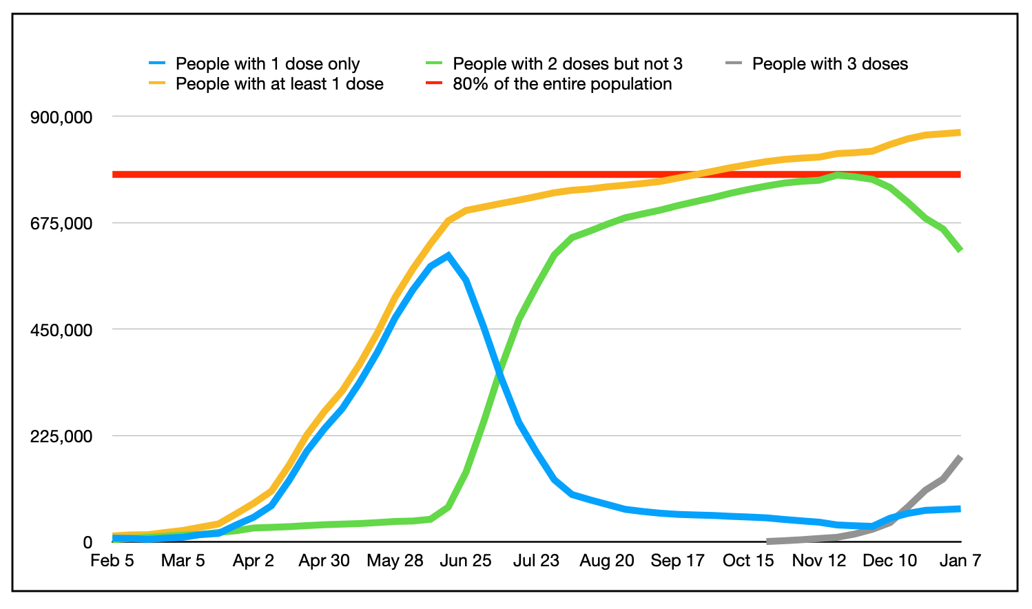 The graph above shows the vaccination progress as captured on Fridays through the pandemic. The yellow line is people with至少一剂疫苗是蓝线的只要one dose. The green line is people with two doses but not three. The grey line is people with three doses. The red line is 80% of the population.