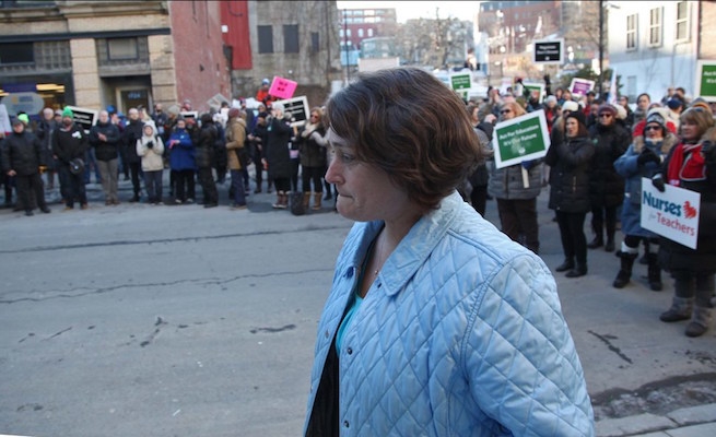 在哈利法克斯省议会外举行的集会上,NSTU校长Liette Doucet向其他教师和支持者发表讲话后离开了会场。这次集会是在自由党政府周二通过第75号法案之前举行的。图片:Tim Krochak / Local Xpress