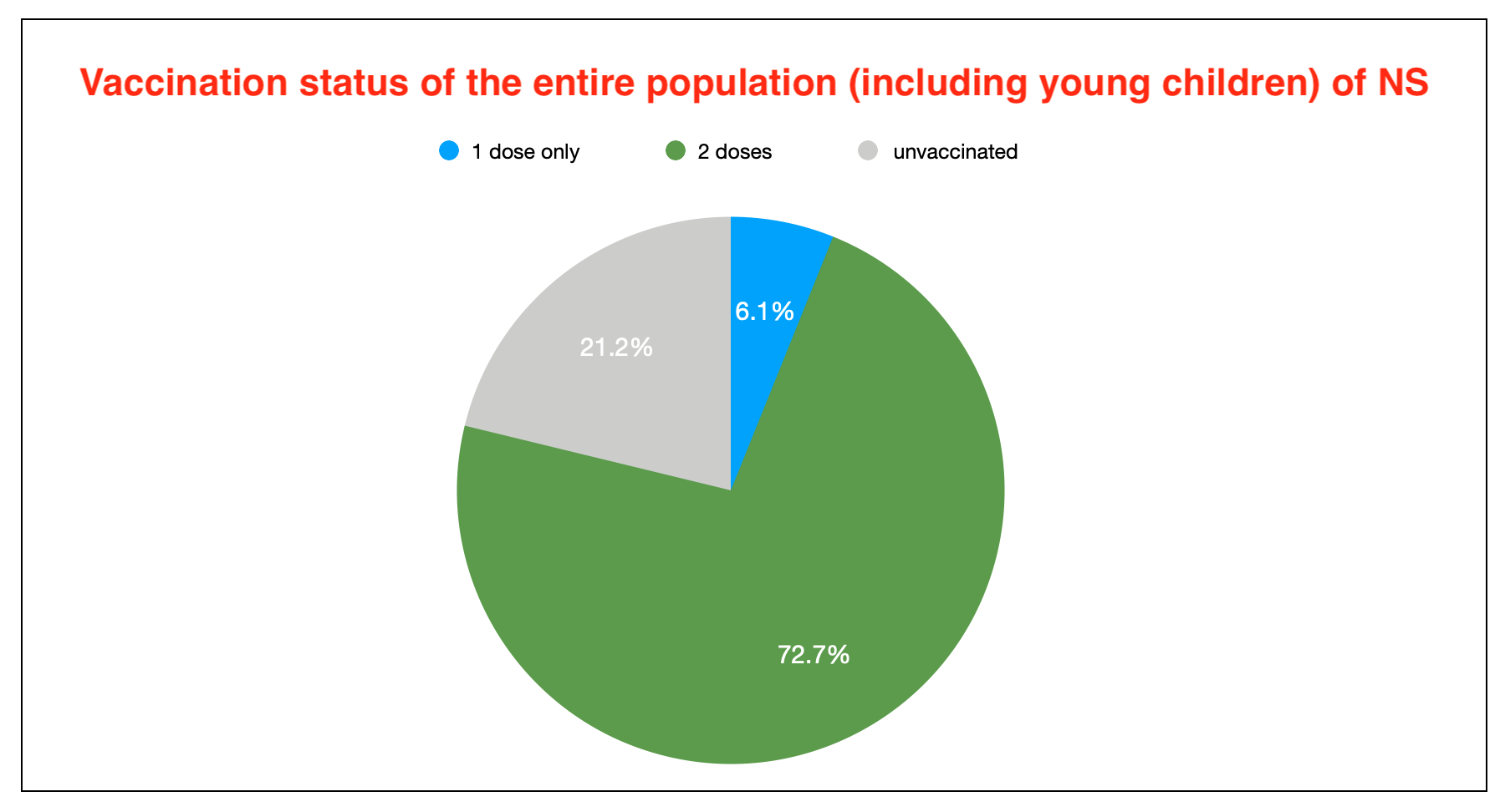 然而,驻扎在新斯科舍省的约8000名军事人员通过军队的疫苗接种计划接种了疫苗,不包括在上述百分比中;如果包括他们,那么双倍剂量的百分比增加到整个人口的73.5%。