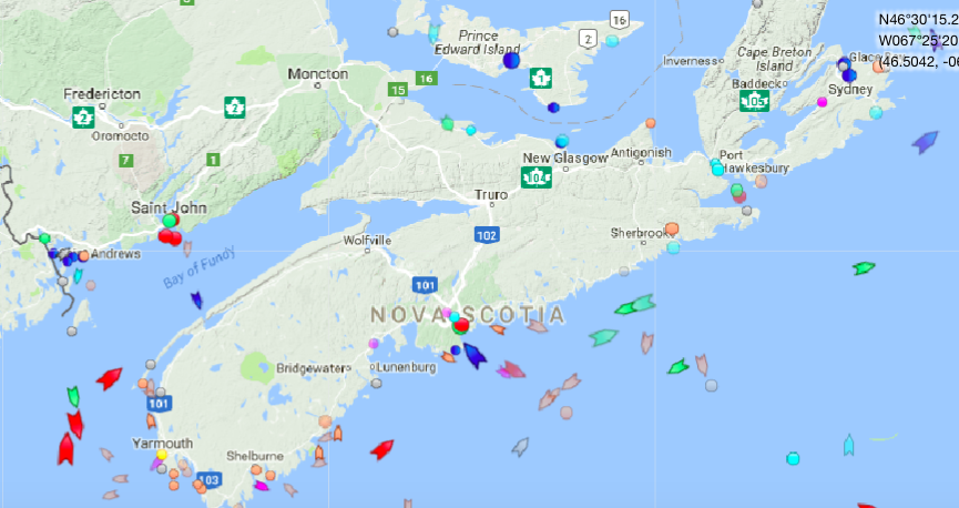 周三上午9:30,新斯科舍附近海域。地图:marinetraffic.com