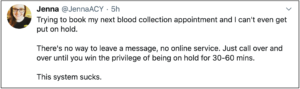 “我在预约下一次的采血预约,却连个暂停都没有,”她在推特上写道。“没有办法留言,没有在线服务。只需一遍又一遍地,直到您赢得30-60分钟的特权。这个系统很糟糕。“