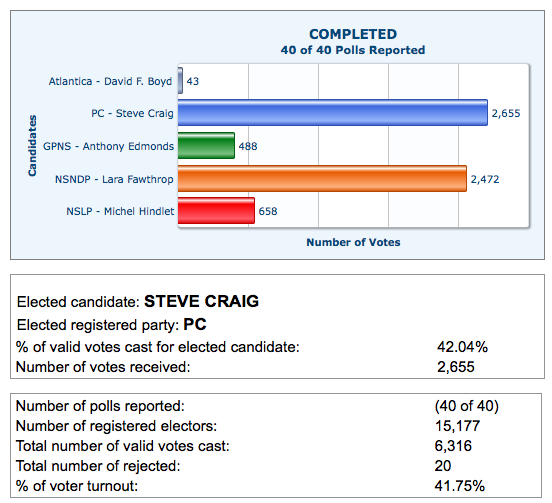 史蒂夫克雷格赢得萨克维尔 - Cobequid工作重点的补选。(初步结果的上方。)