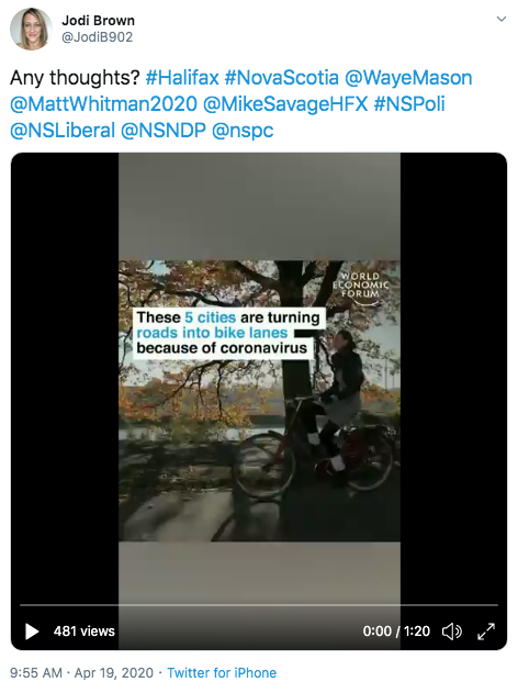 推特用户Jodi Brown询问哈利法克斯的政客们,看看其他城市在为骑自行车的人增加空间方面做了什么。
