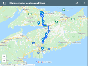 我被广播新闻报道吵醒,新斯科舍省波塔皮克市有一名活跃的枪手。我得在地图上查一下。加拿大广播公司的新闻播音员说,警方建议那里的人们锁好门,待在室内。然后,新闻不断更新,越来越离奇。“几名”受害者…被指控的枪手是达特茅斯的一名牙医…被认为是武装和危险的…他可能驾驶着一辆看起来像皇家骑警车的汽车…他可能穿着一件仿仿的皇家骑警制服…在这里看到…在那里看到…房子着火…肯定有多人伤亡…警察中枪…警车着火…枪手在距离Portapique近100公里的Enfield Big Stop被捕!…等等!怎么啦?怎么做?据报枪手死亡,至少一名警察死亡
