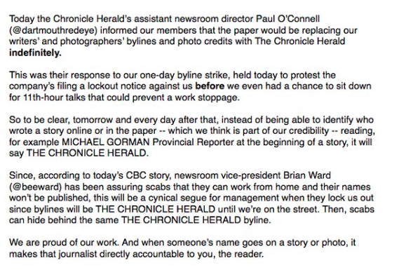 昨天,代表《纪事先驱报》编辑部员工的哈利法克斯印刷工会发布了以下新闻稿: