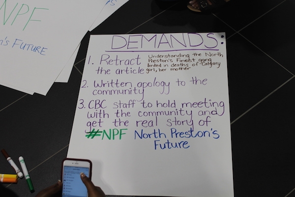 由于对加拿大广播公司关于北普雷斯顿社区的“解释者”感到不满,8名抗议者突袭了加拿大广播公司在哈利法克斯的办公室,要求撤回声明。