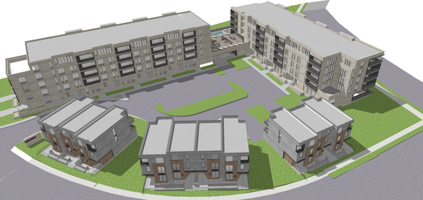 公众信息会议-案例20983(周四晚上7点,哈利法克斯达金路3号圣彼得圣公会教堂)-阿兹米·阿尔纳特想要建造邓布拉克街(Dunbrack Street)和温特沃斯路(Wentworth Drive)交叉口东南角的一栋有90个单元的公寓楼和10栋联排别墅。这是上面开发方案的效果图。