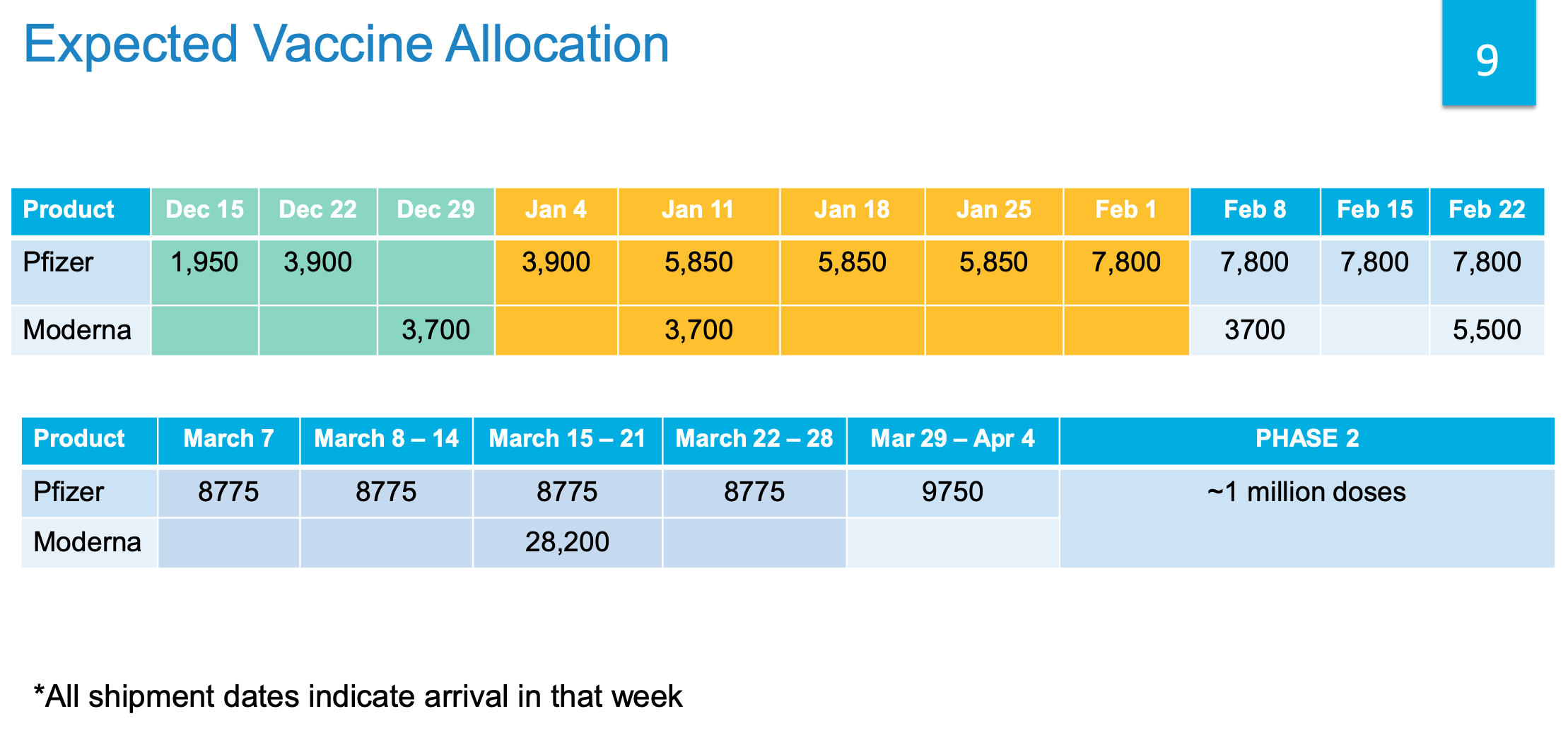 表中最早提出的一个问题是,计划在12月15日至1月4日期间交付13450剂,而CBC报告的交付数量只有2720剂(https://www.cbc.ca/news/canada/nova-scotia/6-new-cases-of-covid-19-detected-in-n-s-on-the-weekend-1.5860732). 计划很好,但准确报告交付情况对于跟踪我们的进度至关重要。