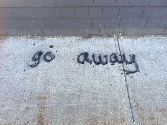 某人呢喷漆“走开”Farley Blackman的艺术画廊外面?那些有限的人受到言语具有普遍含义的想法可能会解释为“消失”,但你认为可能会说“90离开?”呵呵?你?