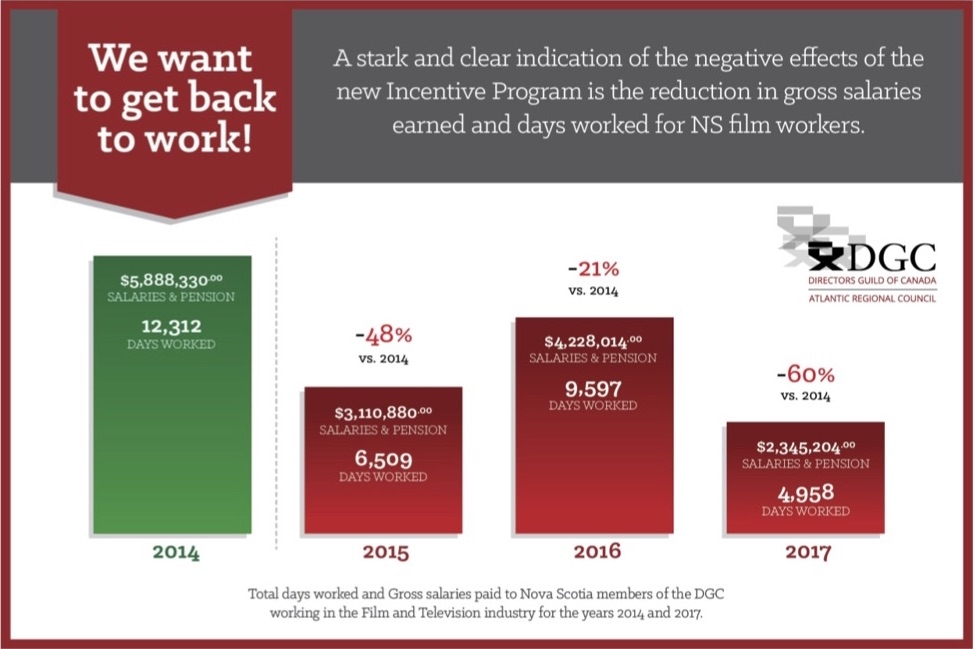 IATSE Local 849是该省大多数电影技术人员的工会,其统计数据显示其成员在2014年工作了40,687天,收入为11,120,665美元的总薪水和养老金。在2017年,这些数字在悬崖上跌落:仅13,454天的薪水和养老金工作 - 比2014年低3,842,454美元,低65%。