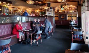 在Finbar 's Bedford餐厅内部,50%的座位已经被移除,以确保桌子之间保持6英尺的距离,以保持社交距离。图片来源:伊维特·德·恩特蒙特