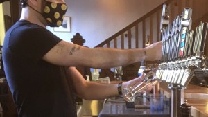 一个戴着面具的酒保倒了一杯啤酒。自去年夏天重新开放以来,在职员工不得不戴上口罩,此前是该省第一次强制关闭。图片来源:Ethan Lycan-Lang