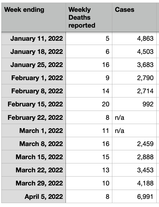另外,从3月30日到4月5日的7天内,有8人死亡。这比截至2月15日的一周20人死亡的峰值有所减少。