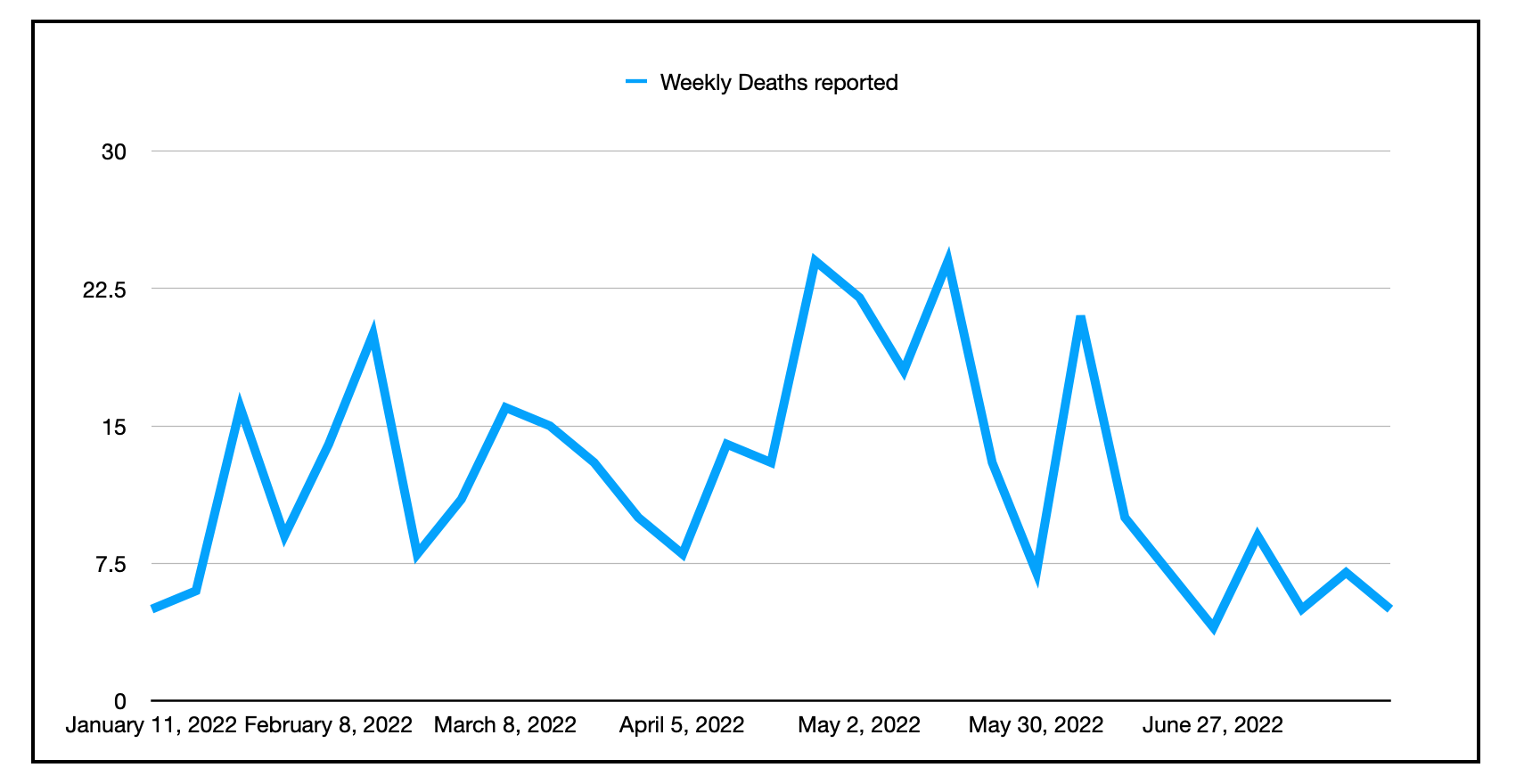 自1月以来,新斯科舍省每周的COVID死亡人数。由于报告周期的变化,截至4月11日的一周只有6天。