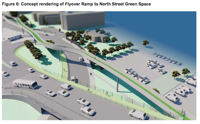 Halifax的潜在未来自行车桥的渲染,将麦克唐纳桥梁连接到北部和雷丁街。