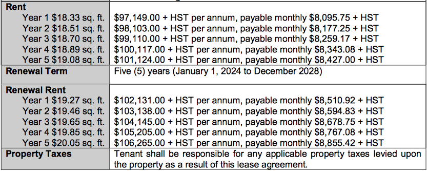 市场价值是与目前加拿大运动中心租户支付的租金比率(租金比率为每平方英尺19.00美元,运营成本为每平方英尺15.47美元,总租金比率为每平方英尺34.47美元,加上HST)相比较而确定的。与CSCA的拟议租赁协议被认为低于市场价值,因为总租金为每平方英尺18.33美元,加上HST。该空间的提议租金为每平方英尺16.14美元,低于该设施当前的市场价值。此外,设施内的所有租户都有责任支付相应比例的财产税。
