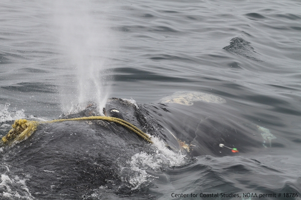 右鲸#1142在表面上呼吸,就像箭头接近缠绕在她的上颌周围的缠绕绳子一样。沿海学习中心,NOAA许可证#18786。