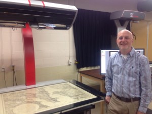 保罗Maxner,在新斯科舍省档案馆档案资深在线资源,与一些扫描设备的工作人员使用,以如地图数字化记录。图文:苏珊出租