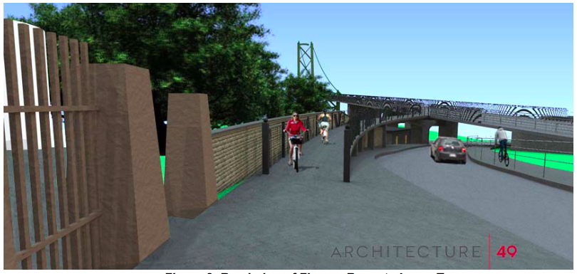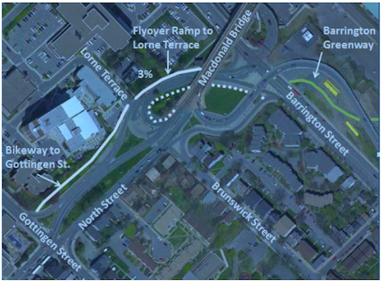 如图5和图6所示,该方案建议在麦克唐纳大桥西桥墩上方的现有自行车道(北街上方约10米)上建造一个弓形桥。从这里开始,它沿着北街的曲线,在一个缓坡(3%)下降90米,降落在Lorne Terrace (CFB Stadacona的入口)之前。从这一点出发,将在北街的绿色空间中探索一条双向自行车道,它位于北街和CFB Stadacona之间,并连接到Gottingen街。