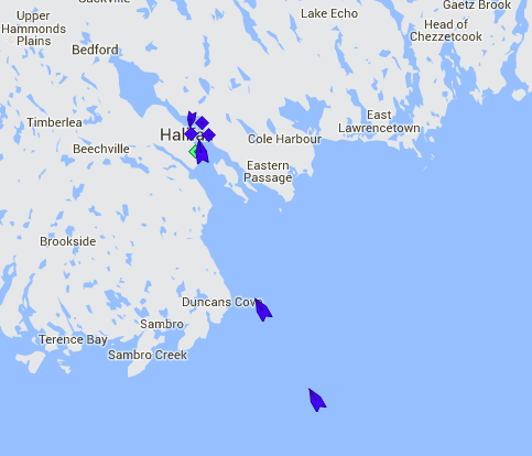 周二上午八点半,哈利法克斯港入口。地图上蓝色的船是客船。“海洋的宏伟”号游轮就在邓肯湾附近,“海洋的光辉”号紧随其后。挪威黎明和Eurodam在HalTerm已经绑起来。内港的其他蓝色船只是渡船。地图:marinetraffic.com