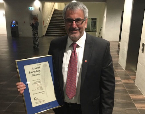 这就是我,在周六晚上的大西洋新闻奖颁奖典礼上,捧着企业报道:印刷类的金奖。
