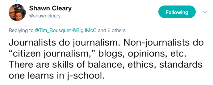 我告诉你这是为了说,除了上课以外,我还没有真正注意到太多东西。但昨天早上,我有几分钟的时间,我吃了格兰诺拉麦片,喝了一杯咖啡,然后赶公共汽车,所以我打开推特,看看发生了什么。我参加了议员肖恩·克利里和其他人之间的一次交流,询问克利里对市政厅说客登记处的看法。但是,砰克利里开始奇怪地攻击我没有新闻学位: