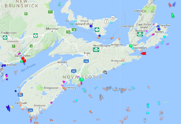 周三上午9点15分,新斯科舍附近海域。地图:marinetraffic.com