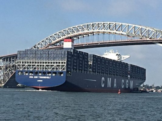 CMA CGM Theodore Roosevelt看到了Bayonne桥下。照片:Hudson记者