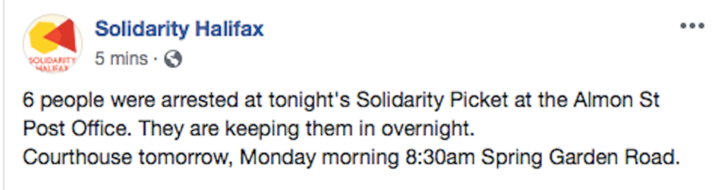 I was sitting at home when I got the community call-out for a solidarity action at the Canada Post on Almon Street on Sunday night. Since I live in the area, I decided to go down and see what was happening and join in to support the postal workers.