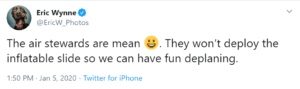 埃里克·韦恩,《纪事先驱报》的摄影师,当时在飞机上告诉记者伊恩·费尔克劳如果飞行员没有告诉乘客,飞机就会逃离柏油碎石粉,他不会知道。他说飞机在着陆期间摇摆有点摇动,但有“没有暴力运动”。他看着窗外,可以看到雪中的一些草。