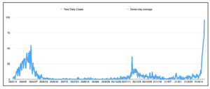 Tim Bousquet的图表追踪了自去年春天流感大流行以来新斯科舍省每天的新病例。请注意今年4月出现的令人不安的飙升。
