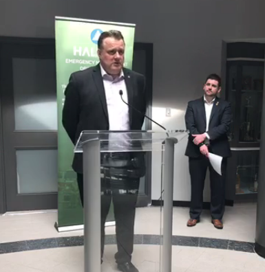 2020年3月17日星期二,在人力资源管理新闻发布会上,市长迈克·萨维奇站在讲台上,哈利法克斯运输总监戴夫·雷奇。