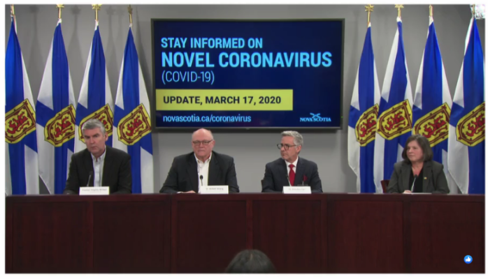 新斯科舍省总理斯蒂芬·麦克尼尔,首席医疗官罗伯特·斯特朗博士,新斯科舍省卫生局首席执行官布伦丹·卡尔博士,IWK健康中心首席执行官克里斯塔·贾嘉德博士新斯科舍省冠状病毒更新,2020年3月17日.