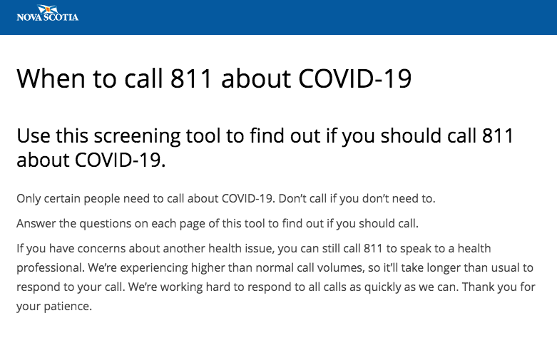 普遍的建议是,如果你出现了新的咳嗽或发烧,这两种症状都是COVID-19的症状,请拨打811,但为了减轻811的异常呼叫量,该省已经推出了一个在线评估工具帮助人们决定他们是否真的应该拨打811和护士谈谈,还是做其他事情。