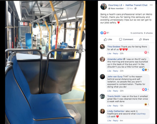 一位医护人员在网上表示感谢,他乘坐哈利法克斯公交上班。2020年3月17日。