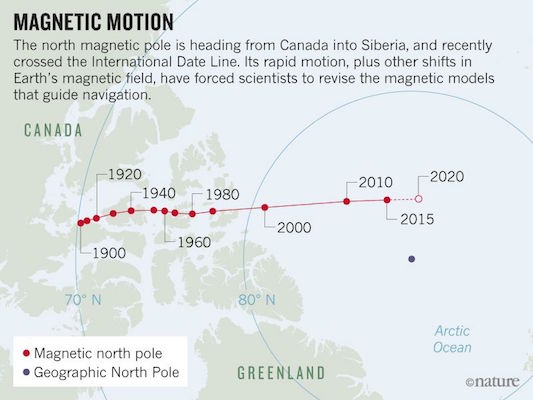 地球磁北极已经从加拿大和西伯利亚向远离skittering由液态铁地核内晃动驱动。磁极如此快速移动,它已经迫使全球地磁专家为罕见的举动。