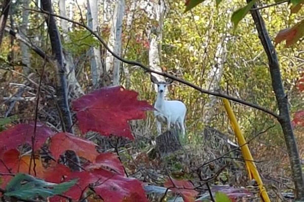 “一只罕见的全白鹿在新墨西哥州的梅兰库克被河景市的市议员布鲁斯·费奇发现。”Alexander Quon为您报道。