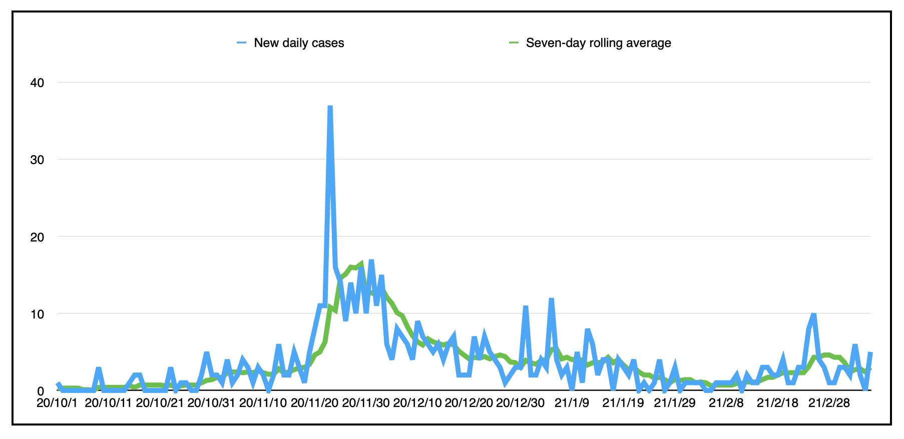以下是自第二波(10月1日)开始以来新的每日病例和七天滚动平均值(今天为3.0):