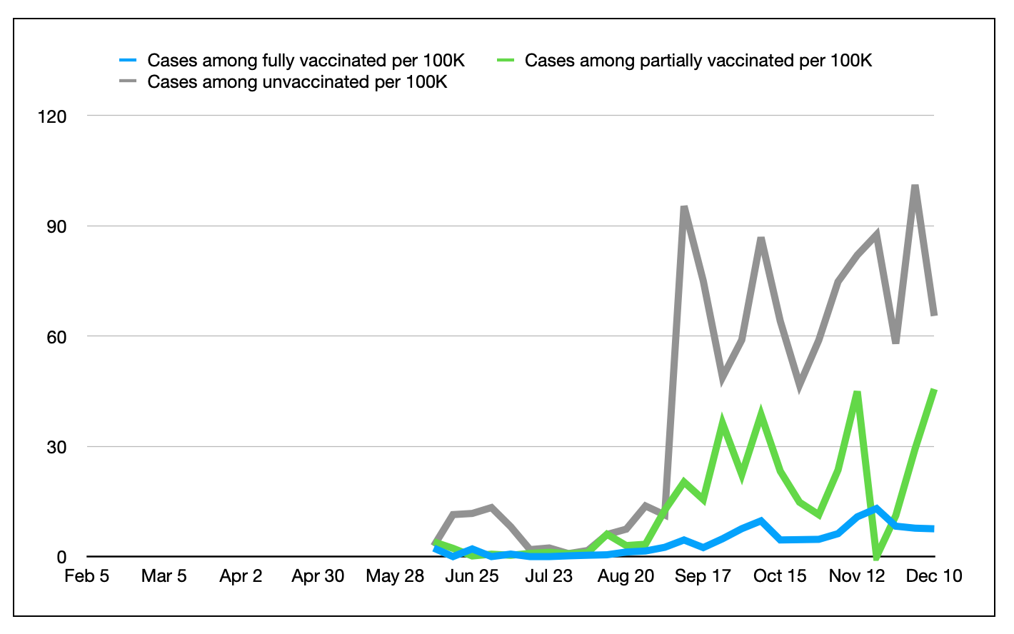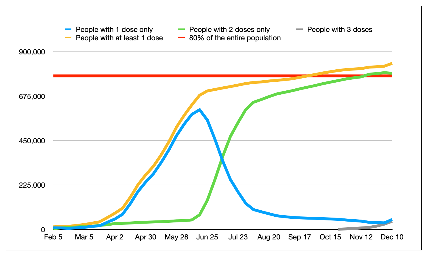 上图显示了流感大流行期间每周五的疫苗接种进展情况。蓝色的线是只接种了一剂疫苗的人;绿线是服用两剂的人;黄金线是人与至少一剂;灰色的线是服用三剂的人;红线表示80%的人口。