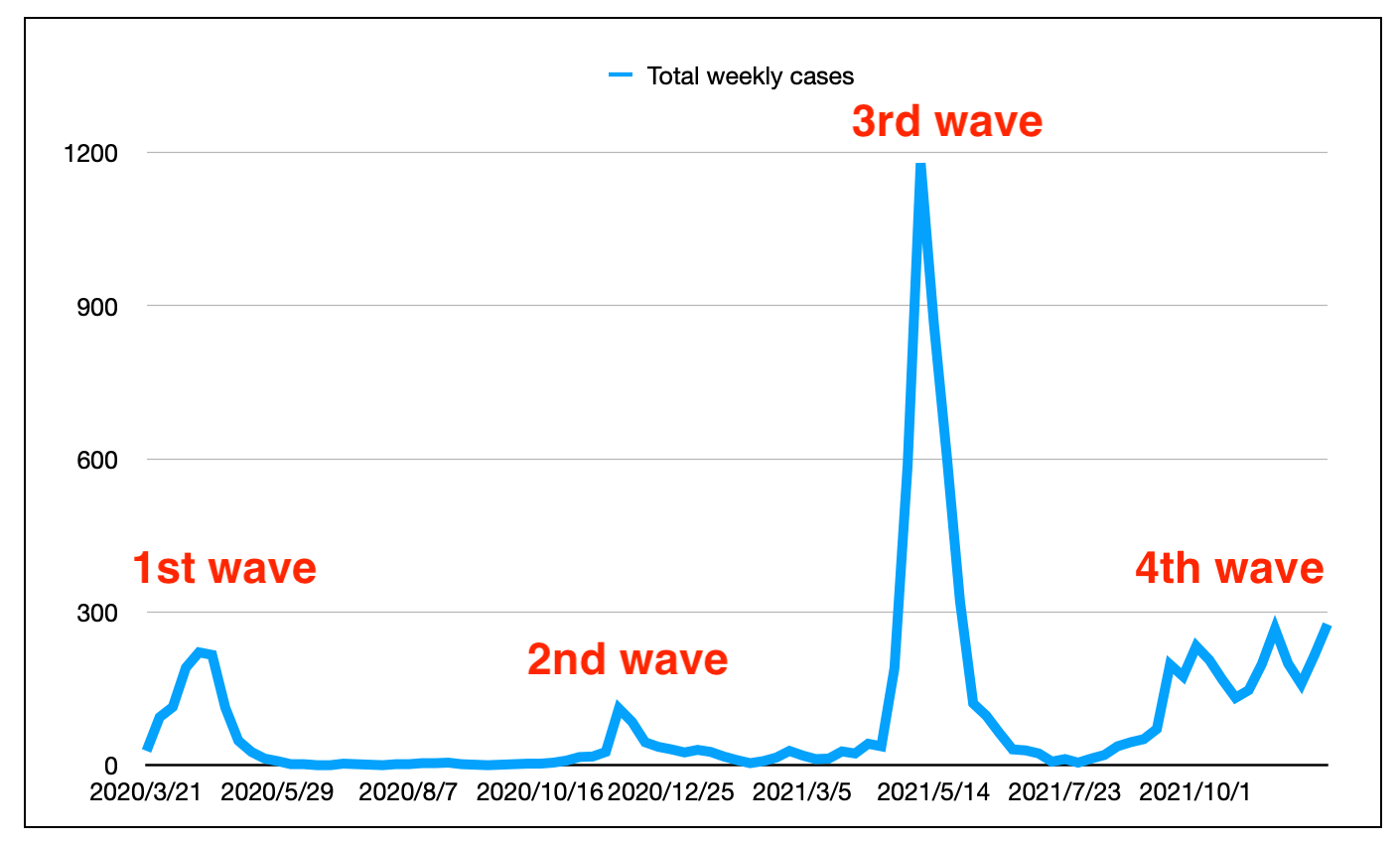 上面的图表显示了大流行期间每周(星期六至星期五)的新病例数量。