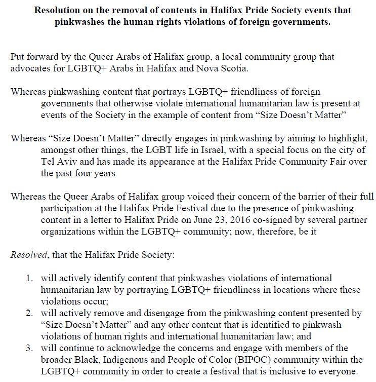 但哈利法克斯的酷儿阿拉伯人提出了一项决议,谴责SDM“粉红清洗”以色列延续的侵犯人权行为: