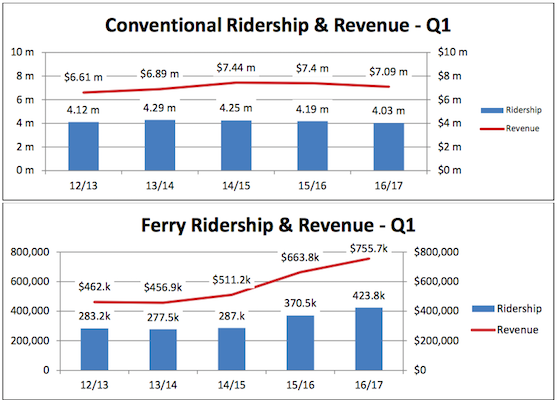 运输常务委员会(市政厅,下午1点)——委员会将收到哈利法克斯运输公司2016年第一季度的运营报告。公交客流量下降了,但渡船客流量略有增加: