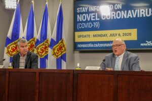 总理斯蒂芬·麦克尼尔(左)和首席医疗官罗伯特·斯特朗博士在新冠病毒-19更新会议上,2020年7月6日